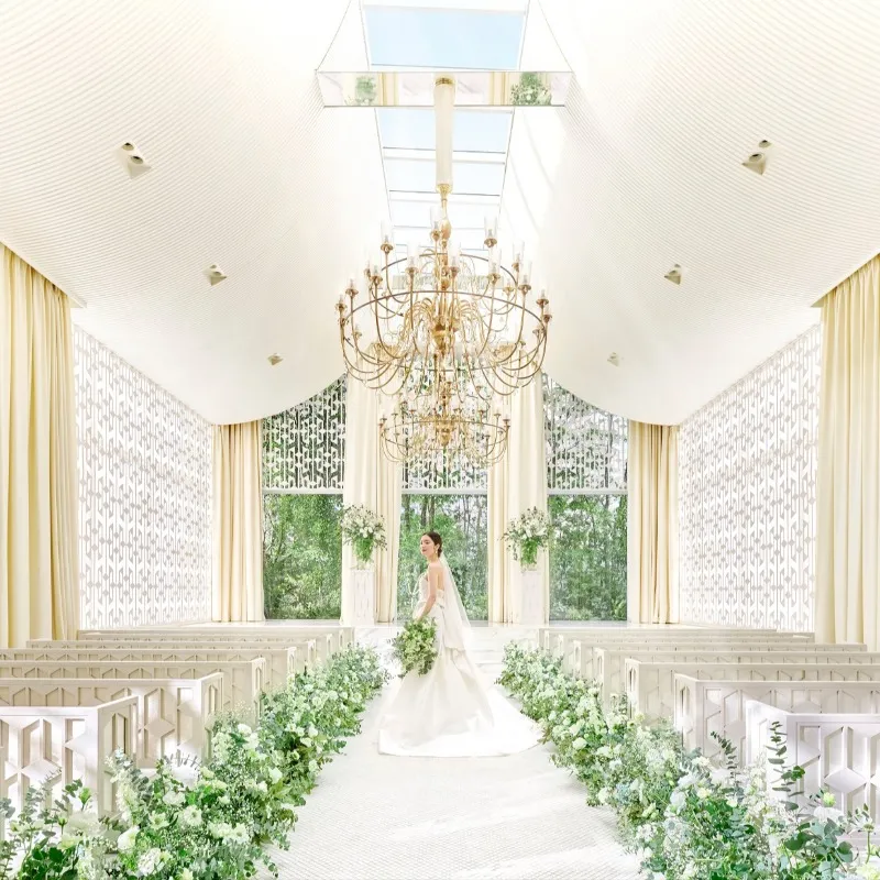 【優しい光に満ちたチャペルは先輩花嫁絶賛!】天井高7mと圧巻スケール×シャンパンゴールドのシャンデリアの煌めき☆彡祭壇向こうには緑を望む上質な雰囲気が人気*フェアでは挙式入場体験で花嫁気分を味わって♪