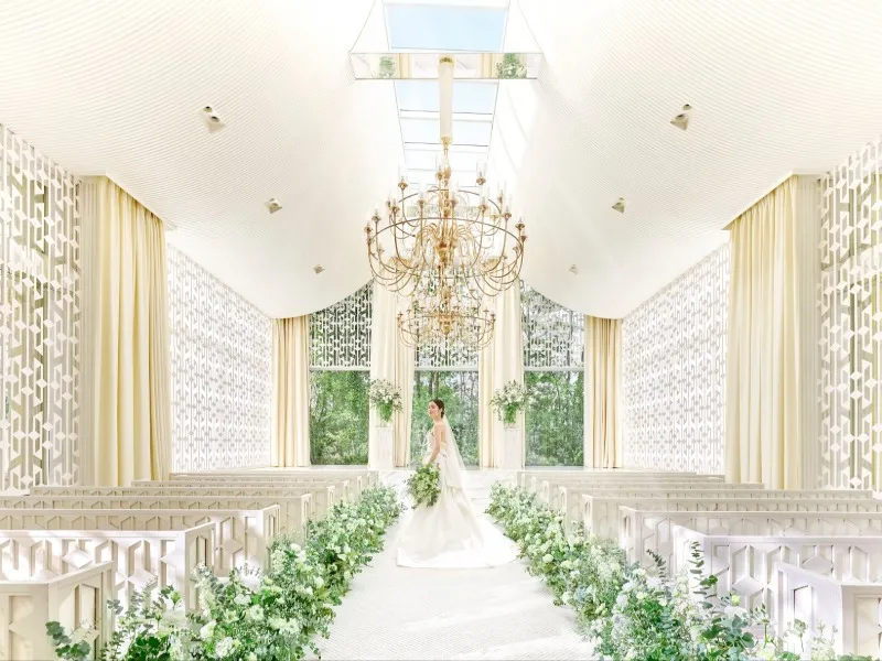 【美しい緑と光に包まれるチャペル!プレ花嫁からも人気】◆天井高7M!名駅すぐとは思えない圧巻のスケールが魅力◆シャンパンゴールドのシャンデリや、天井から差し込む光が上質な雰囲気を演出。フェアで体感して